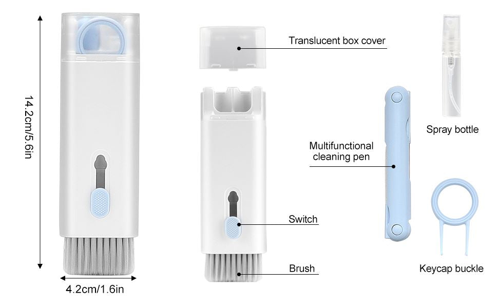Electronic cleaning kit includes a cleaning pen for Airpods with silicone nip, mini brush and flocking sponge brush; high-density soft brush, cleaning spray bottle(empty), fiber fleece swipe and keycap buckle. The kits can clean headphones, keyboards, PC monitors, phones, cameras etc.